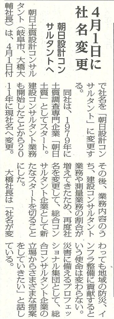 2026.03.27ニュースリリース 建通新聞・岐阜新聞に社名変更について掲載されました。 このたび、建通新聞(2026年3月23日付)と岐阜新聞(2026年3月27日付)で当社の社名変更が紹介されました。新社名のもと、これまで以上に日々の業務に取り組んでまいります。 前の記事へ 一覧へもどる 次の記事へ